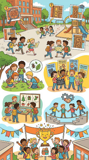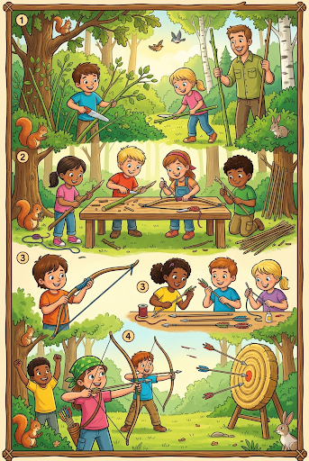 Børnene laver deres egne buer af hasselgrene og snor. De lærer om spænding og sigte, mens de skyder efter skiver lavet af halm eller pap.